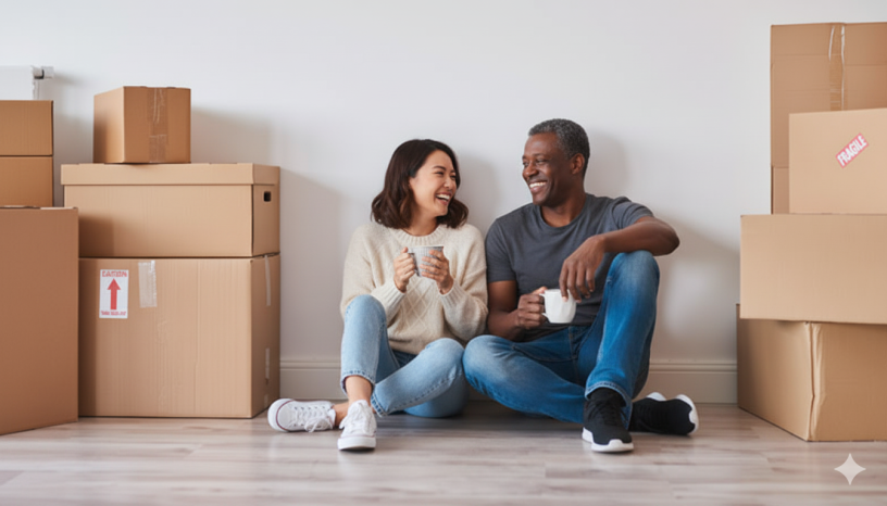 Casal sorridente, um homem e uma mulher, sentados no chão de uma divisão com muitas caixas de cartão empilhadas à volta, a beber algo em canecas, possivelmente após se mudarem para uma nova casa.